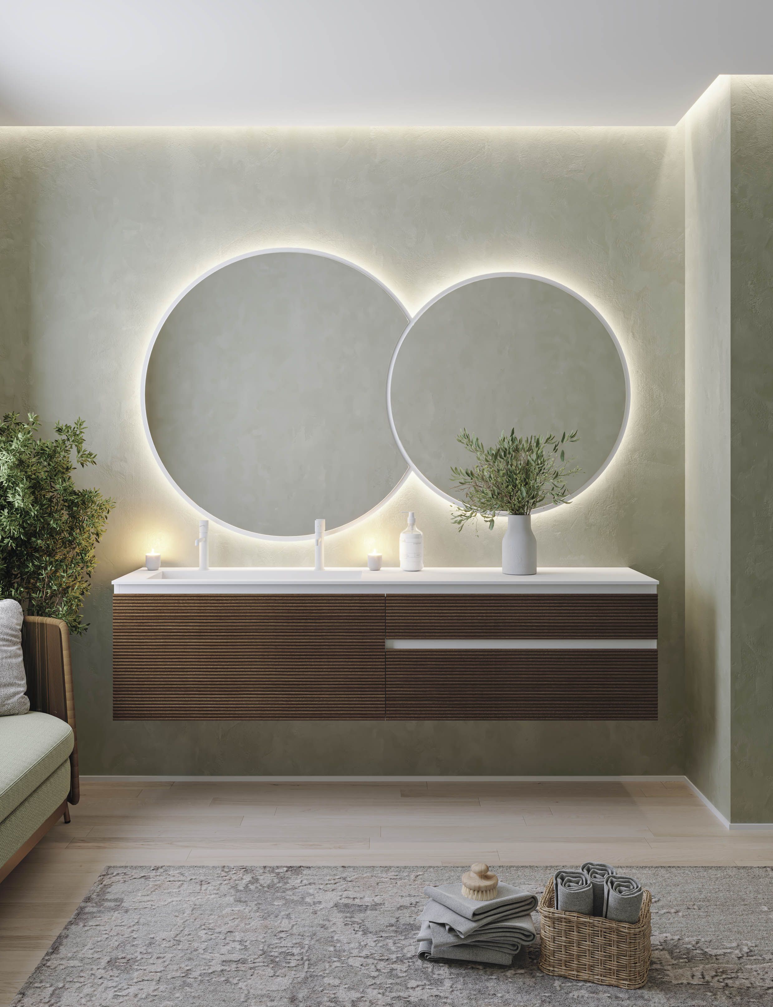 Serie con texturas de tendencia para una colección moderna que presenta una estética totalmente actual que se adaptará a todo tipo de propuestas decorativas para cuartos de baño, donde el mueble tendrá gran protagonismo estético.